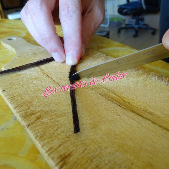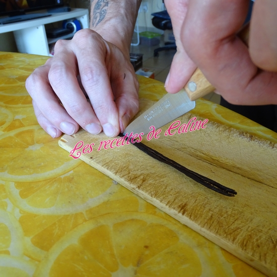 Fendre la gousse de vanille et gratter la gousse pour récupérer les graines (garder la gousse, elle va vous servir).