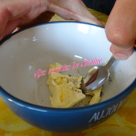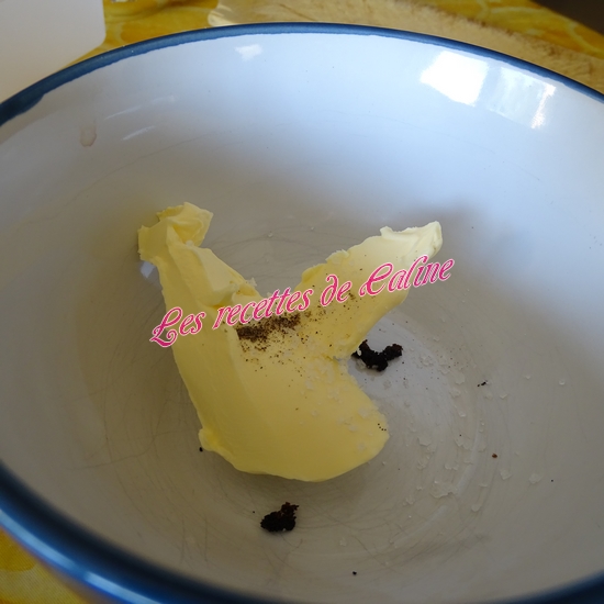 Malaxez le beurre mou (pas fondu) avec les graines de vanille, un peu de sel et de poivre.