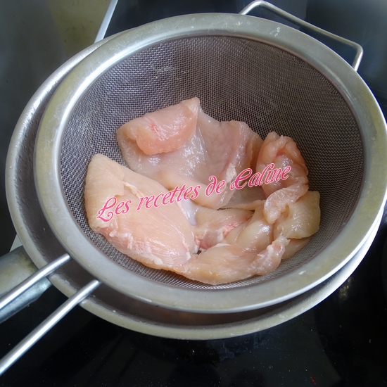 Si vous êtes comme moi que vous n’avez pas de cuit vapeur, voici l’astuce à la Mac Gyver, il vous suffit d’avoir une passoire (ou chinois), placez vos escalopes dedans. Mettre de l’eau dans une casserole, ATTENTION, il ne faut pas que le fond de la passoire touche l’eau, couvrez la passoire d’une feuille de papier alu et faire cuire 10 min.