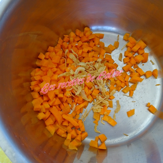 Epluchez et coupez en petits morceaux l’oignon(je passe à la découpe de la carotte vu que j’utilise des lanières d’oignons séchés) et la carotte.