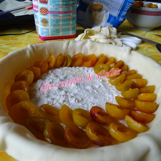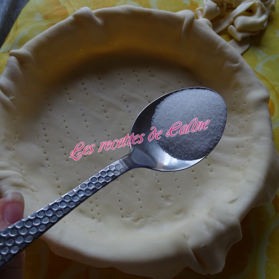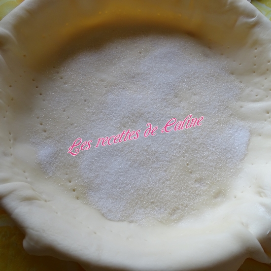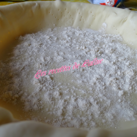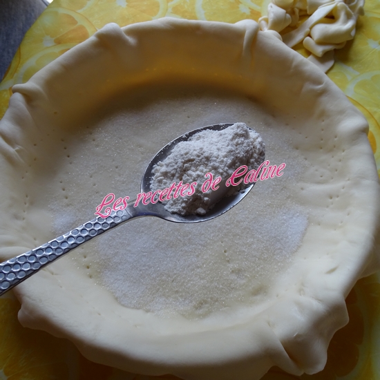 Répartir dans le fond de la tarte : 1 cuil à soupe de sucre en poudre + 1 cuil à soupe de farine.