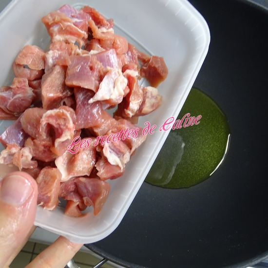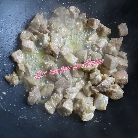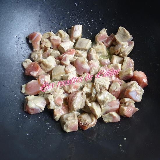 Verser 1 cuil à soupe d’huile d’olive dans le wok, et y faire dorer les morceaux de dinde durant 7 min.