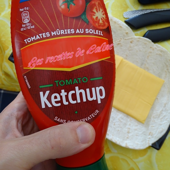 Déposez 2 ou 3 tranches de cheddar, un peu de ketchup, puis déposez 1 steak haché coupé en deux, remettre 2 tranches de fromage puis un peu de ketchup
