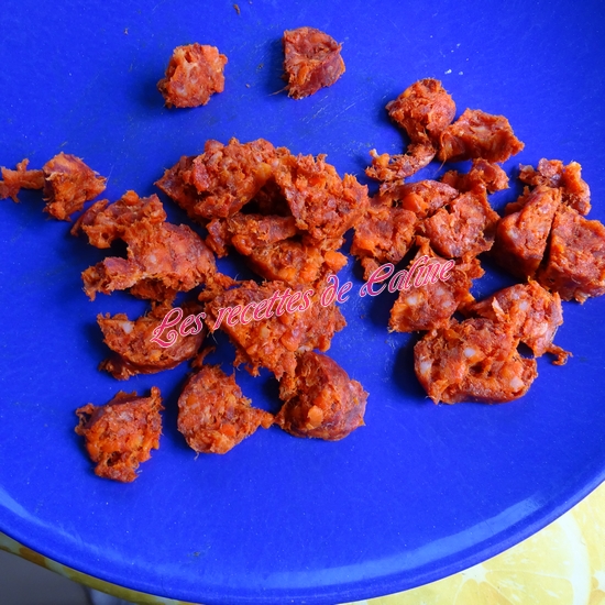Epluchez et coupez la carotte en petits cubes et les linguiças (chorizo) en rondelles.