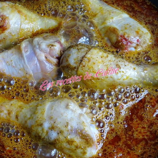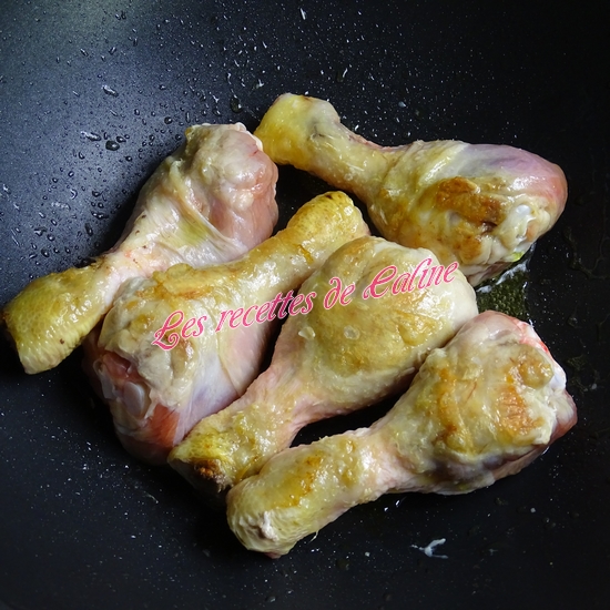 Dans une cocotte, faire chauffer un filet d’huile d’olive et y faire dorer les pilons de poulet, ajouter l’oignon, et faites-le légèrement doré.