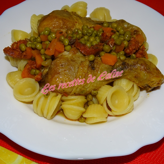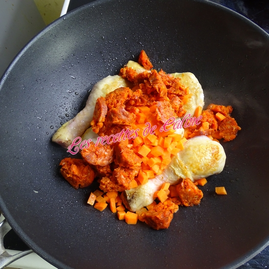 Ajoutez les carottes et chorizo au poulet. Laissez dorer 5 min.