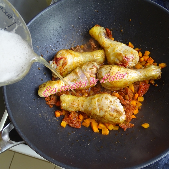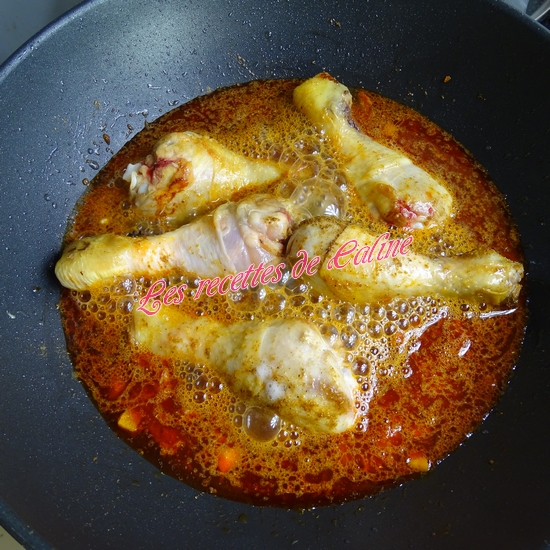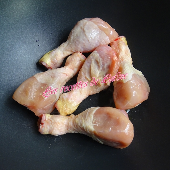 Dans une cocotte, faire chauffer un filet d’huile d’olive et y faire dorer les pilons de poulet, ajouter l’oignon, et faites-le légèrement doré.