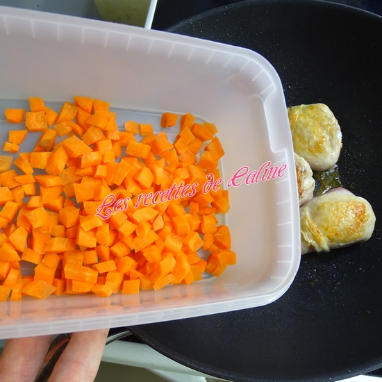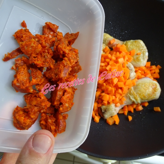 Ajoutez les carottes et chorizo au poulet. Laissez dorer 5 min.