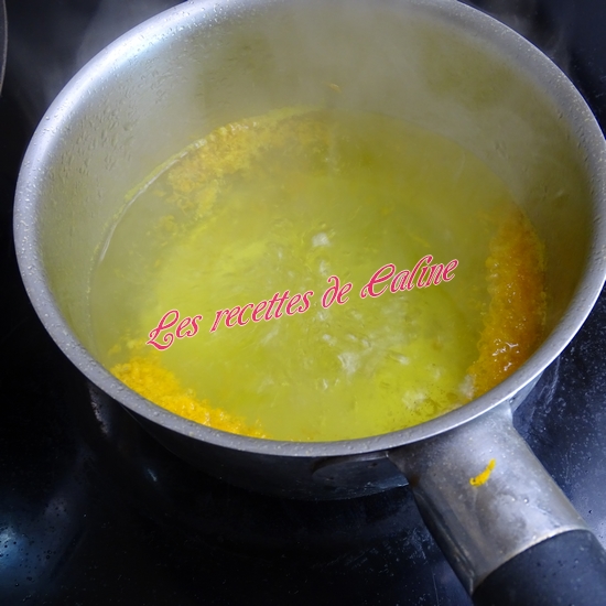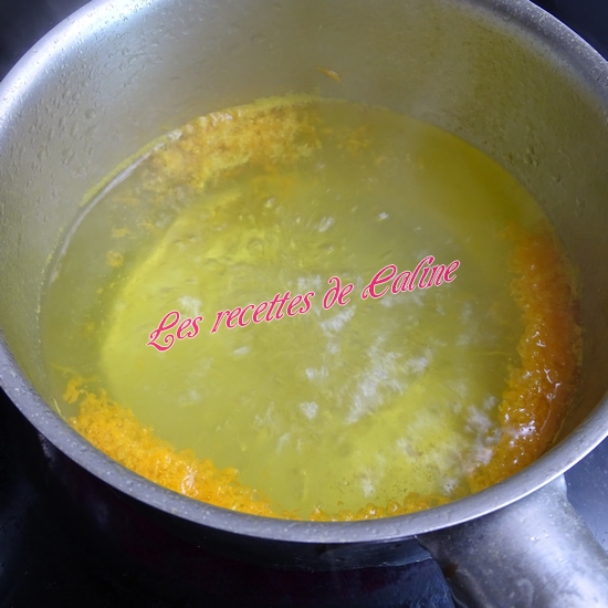 Ajoutez les zestes d’orange, le sucre semoule, le lait de coco et 2 pincées de safran. Laissez cuire 2 min.