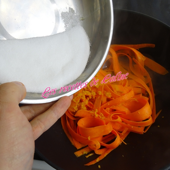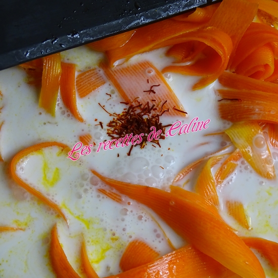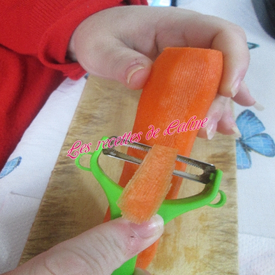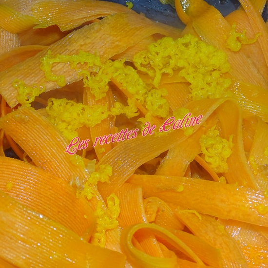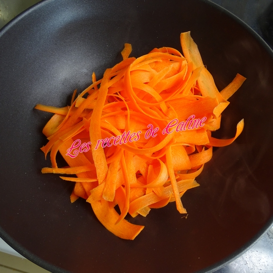Epluchez et taillez les carottes en bâtonnets ou en tagliatelles ( à l’aide de l’épluche-légumes).