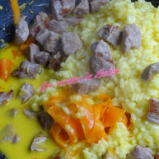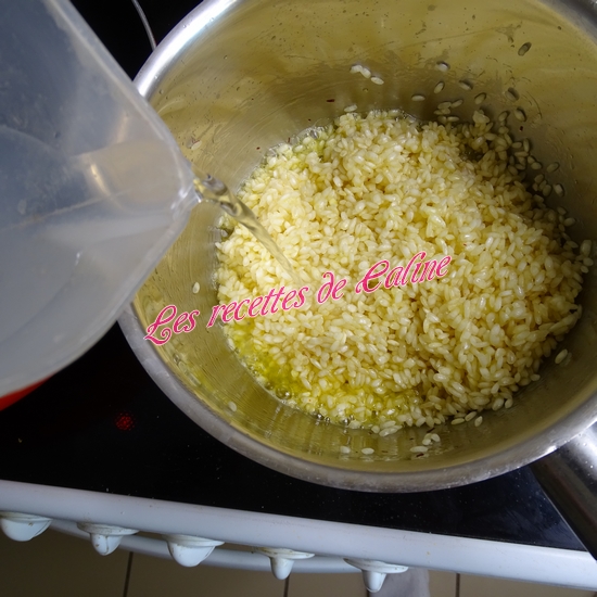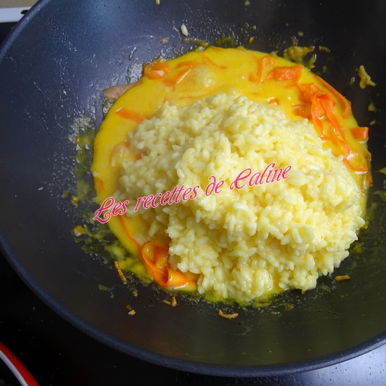 Faites revenir le riz dans 50 g de beurre, 2 pincées de safran. Lorsque les grains de riz deviennent transparents, ajouter 40 cl d’eau. A partir de l’ébullition, comptez 15 min de cuisson à feu doux.