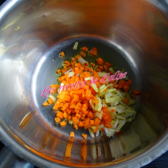 Faites revenir le poireau et la carotte dans une casserole avec 1 cuil à soupe d’huile d’olive .