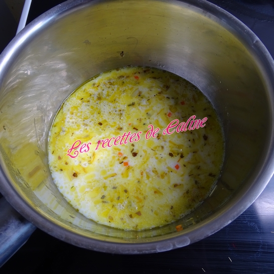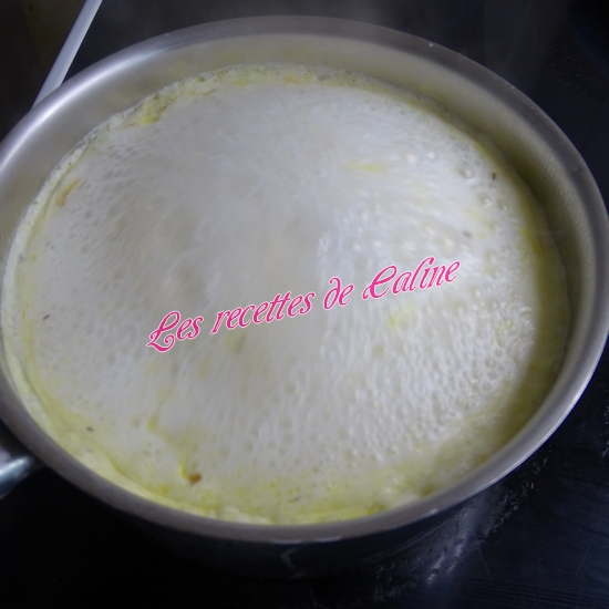Ajoutez l’ail, le thym, le laurier puis le lait et portez à ébullition. Arrêter le feu et couvrir. Laissez infuser 15 min à couvert.