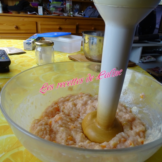 Mixez finement le poulet coupé en gros dés, ajoutez ensuite l’œuf, la Maïzena, le lait (je n’ai pas mis les 20 cl de lait, j’y suis aller petit à petit car j’ai eu peur que la préparation soit trop liquide), les légumes sauf le thym et le laurier(Pour ma part, je le laisse vu que c’est du laurier concassé et le thym c’est la fleur, sinon pensez à enlever la feuille et le branche). Salez et poivrez. Mixez à nouveau. On obtient une préparation très crémeuse.