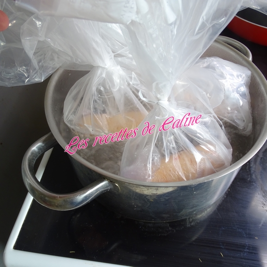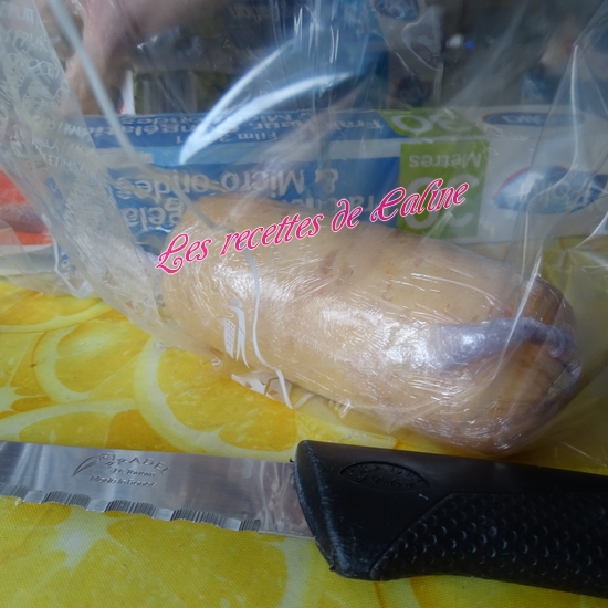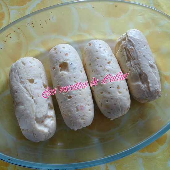 Déposez de longs rectangles de papier film alimentaire sur le plan de travail. Déposez un peu de préparation au centre de celui-ci. Rabattre le film alimentaire se trouvant devant vous vers le haut : prendre les extrémités du film et roulez jusqu’à obtenir un boudin, il faut qu’ils soient hermétiques, une fois mes boudins enveloppé dans le film, j’ai glissé chaque boudin dans un petit sac congélation. (ne pas faire des boudins trop gros pour qu’ils cuisent de façon homogène).