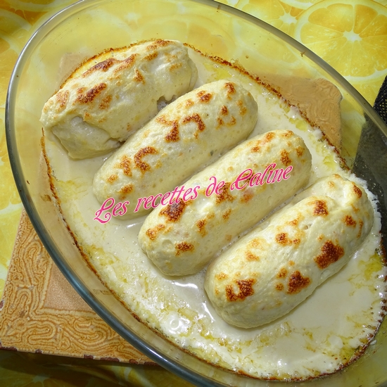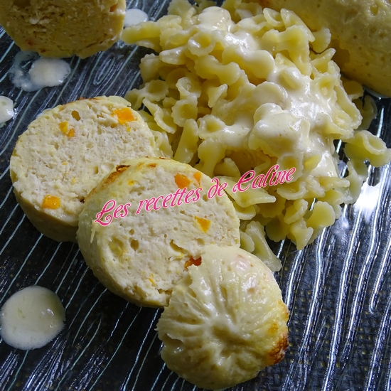Dans une casserole, verser la crème fraîche, le parmesan râpé, faites chauffer et fondre le fromage. Hors du feu ajouter le jus de citron pressé, la sauce va épaissir, fouettez bien et versez cette sauce sur les boudins de poulet.