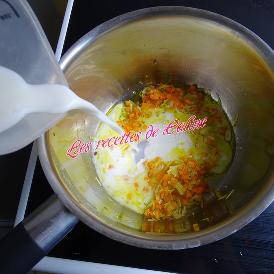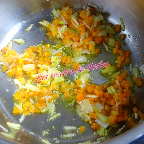 Faites revenir le poireau et la carotte dans une casserole avec 1 cuil à soupe d’huile d’olive .