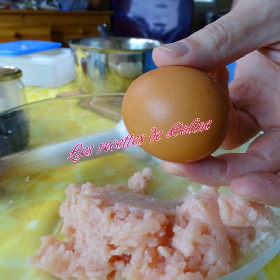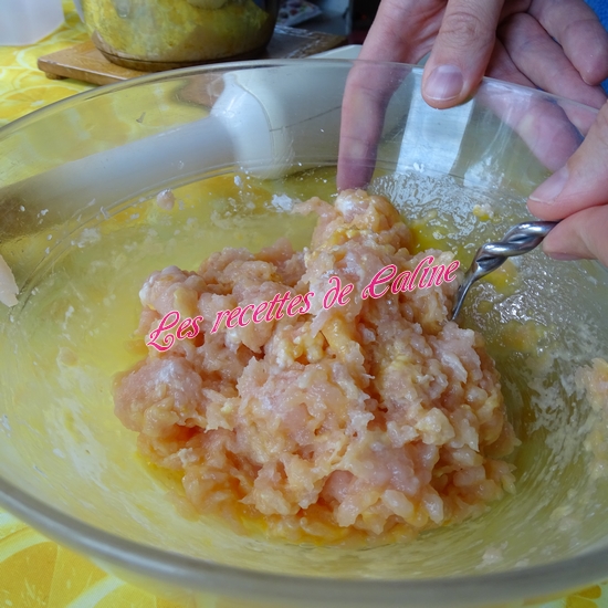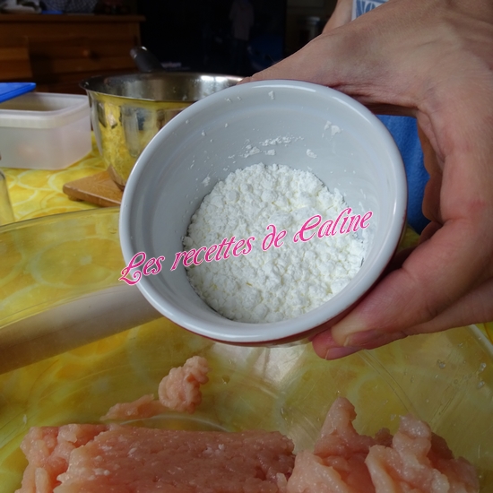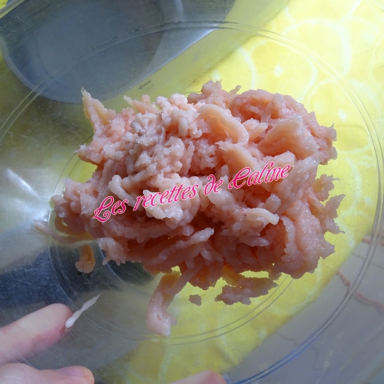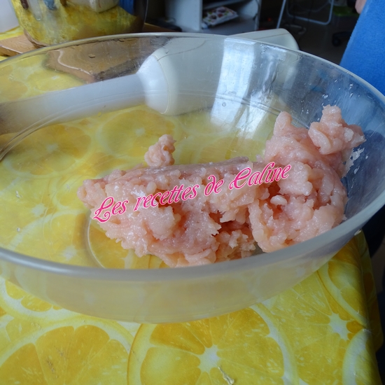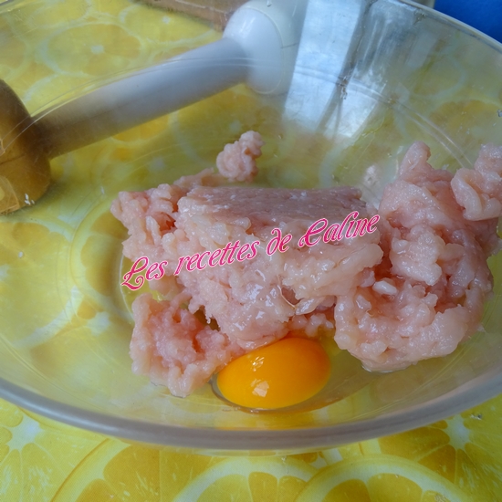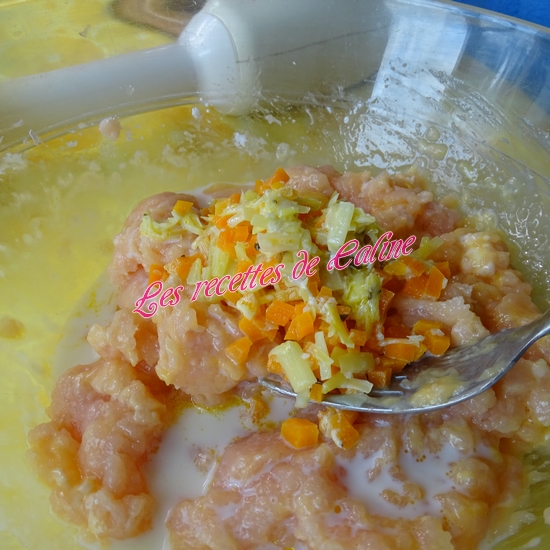 Mixez finement le poulet coupé en gros dés, ajoutez ensuite l’œuf, la Maïzena, le lait (je n’ai pas mis les 20 cl de lait, j’y suis aller petit à petit car j’ai eu peur que la préparation soit trop liquide), les légumes sauf le thym et le laurier(Pour ma part, je le laisse vu que c’est du laurier concassé et le thym c’est la fleur, sinon pensez à enlever la feuille et le branche). Salez et poivrez. Mixez à nouveau. On obtient une préparation très crémeuse.