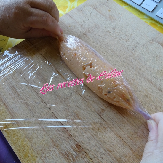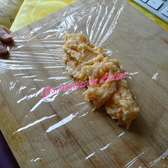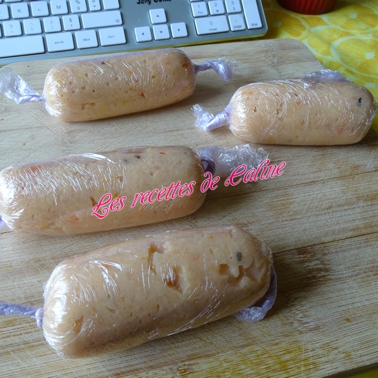 Déposez de longs rectangles de papier film alimentaire sur le plan de travail. Déposez un peu de préparation au centre de celui-ci. Rabattre le film alimentaire se trouvant devant vous vers le haut : prendre les extrémités du film et roulez jusqu’à obtenir un boudin, il faut qu’ils soient hermétiques, une fois mes boudins enveloppé dans le film, j’ai glissé chaque boudin dans un petit sac congélation. (ne pas faire des boudins trop gros pour qu’ils cuisent de façon homogène).