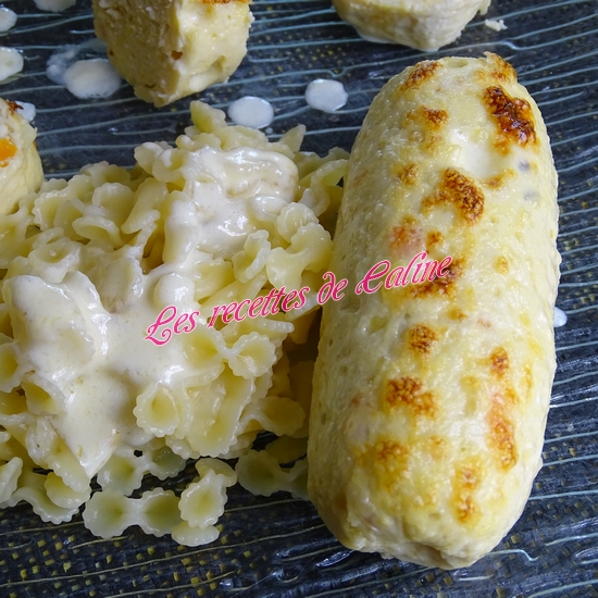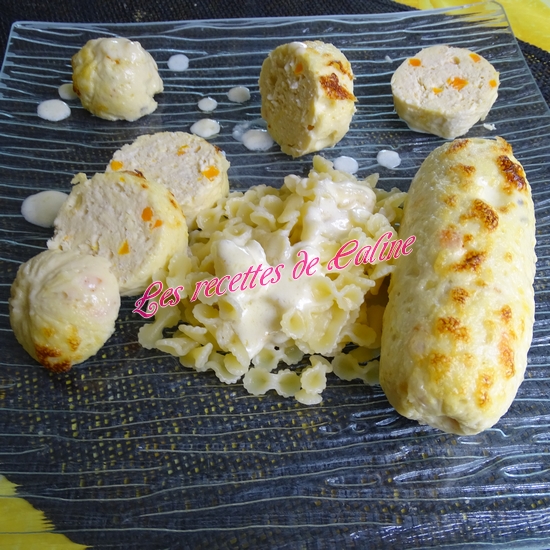 Dans une casserole, verser la crème fraîche, le parmesan râpé, faites chauffer et fondre le fromage. Hors du feu ajouter le jus de citron pressé, la sauce va épaissir, fouettez bien et versez cette sauce sur les boudins de poulet.