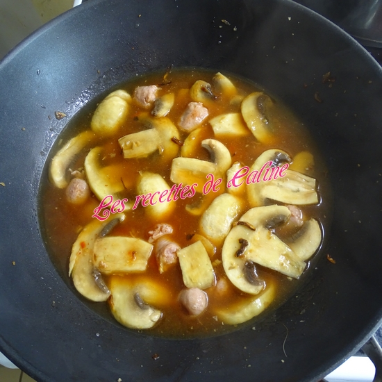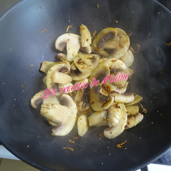 Dans une sauteuse(ou wok) faire revenir les lamelles de champignons, puis ajoutez un filet d’huile d’olive, l’oignon et l’ail et faites-les suer le tout quelques instants.