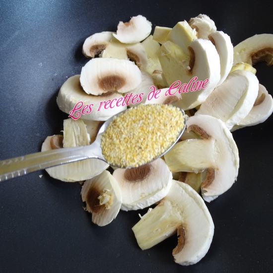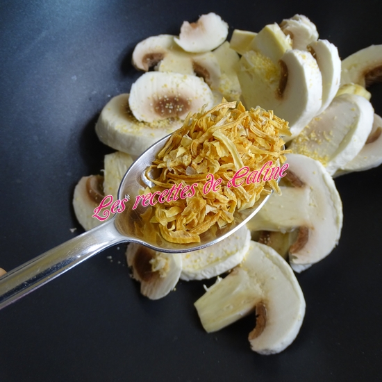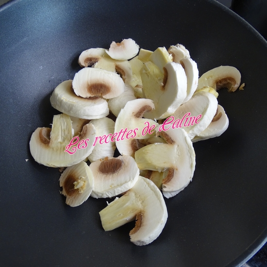 Dans une sauteuse(ou wok) faire revenir les lamelles de champignons, puis ajoutez un filet d’huile d’olive, l’oignon et l’ail et faites-les suer le tout quelques instants.