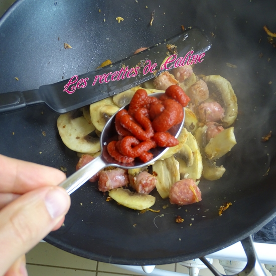 Ajoutez les tronçons de chipolatas, mélanger et laissez cuire 1 bonne minute.