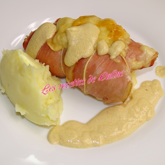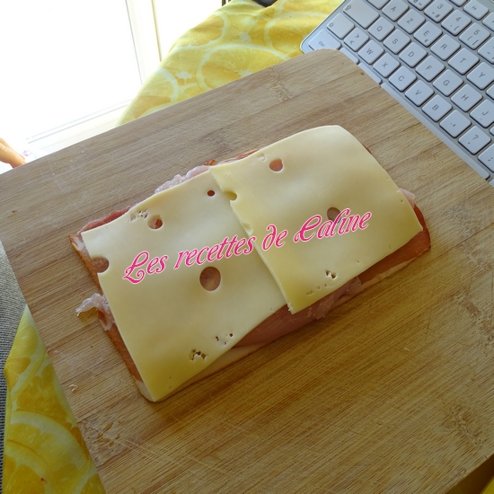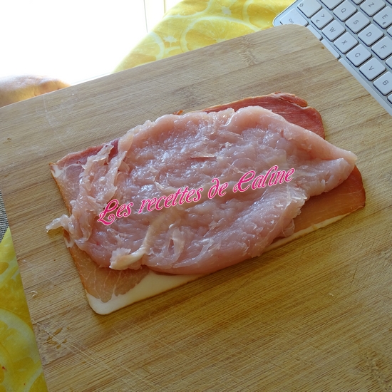 Sur une planche, déposer une tranche de jambon de pays, l’escalope et l’emmental.