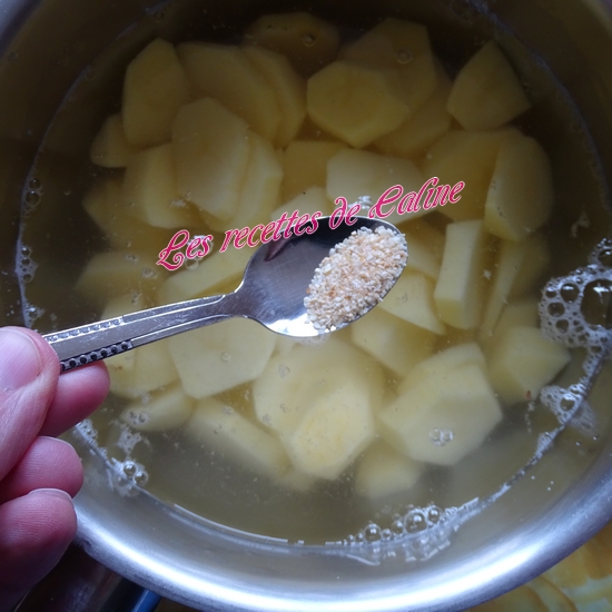 Mettez les pommes de terre a cuire sur feu moyen avec l’ail et le gros sel, couvrir d eau.