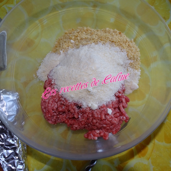 Dans un saladier, mélangez avec les mains la viande hachée à la chapelure, ajoutez le fromage râpé. Salez et poivrez. Lier le tout avec l’œuf auparavant battu légèrement.