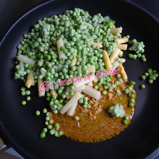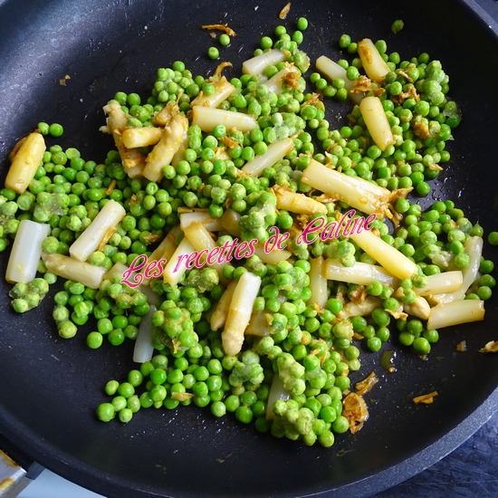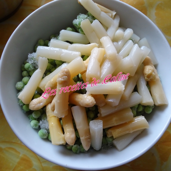 Egouttez correctement les asperges, puis coupez-les en petits tronçons et préparez vos petits pois.