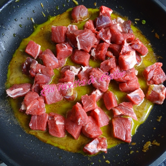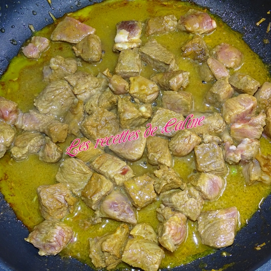 Dans la même poêle, faire revenir les dés d’agneau avec 2 cuil à soupe de beurre épicé.
