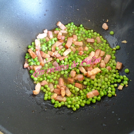 Faites chauffer 1,5 cuil à soupe d’huile dans un wok (ou casserole) à feu moyen, ajoutez le gingembre, faites revenir pendant 1 min environ, ajoutez les lardons, puis les petits pois et la sauce soja, continuez la cuisson pendant 1 min.