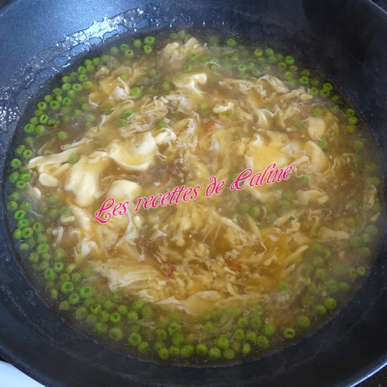 Versez 800 ml d’eau bouillantes dans le wok et augmentez le eu au maximum. Quand la soupe atteint l’ébullition, remuez le mélange fécule-eau et versez en mélangeant constamment.