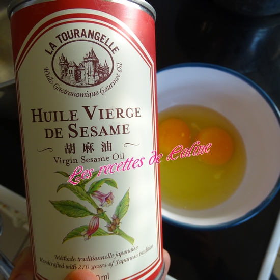 Dans un bol, battez les œufs avec un peu d’huile de sésame.