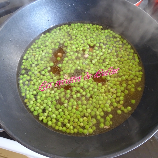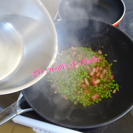 Faites chauffer 1,5 cuil à soupe d’huile dans un wok (ou casserole) à feu moyen, ajoutez le gingembre, faites revenir pendant 1 min environ, ajoutez les lardons, puis les petits pois et la sauce soja, continuez la cuisson pendant 1 min.
