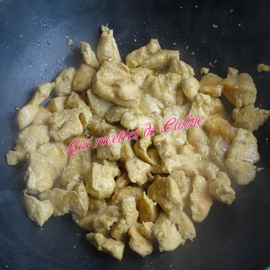 Faites chauffer l’huile dans une grande sauteuse et dorer les cubes de poulet