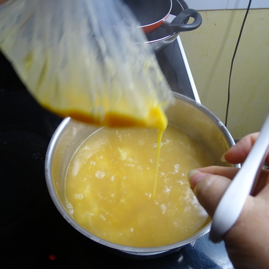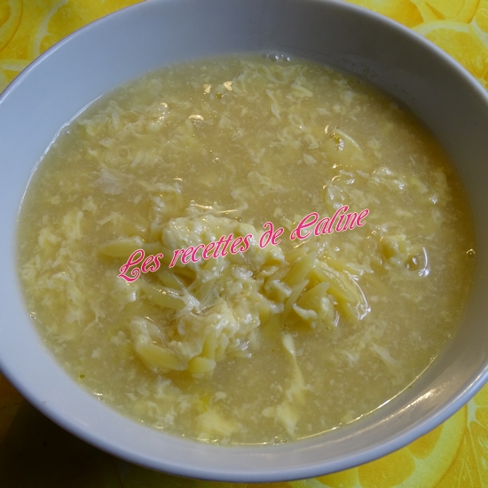 Versez doucement les oeufs (pour ma part, j’ai versé les oeufs dans un sac congélation et j’ai fait comme un système de poche a douille en coupant un petit coin du sac, trou pas trop gros) dans le bouillon (à feu plus doux) en mélangeant en même temps, ça forme des petits filaments! laissez cuire 2-3 minutes
