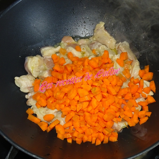 Dans une cocotte (ou wok), faites chauffer l’huile d’olive et faites-y dorer le poulet sur toute les faces.