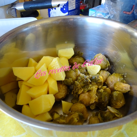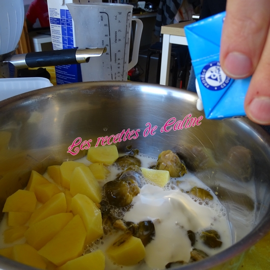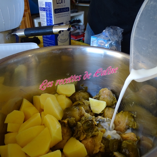 Dans une casserole, y mettre les pommes de terre, les choux, le lait, la crème liquide, le sel et le poivre. Couvrir et laissez cuire 30 min environ (jusqu’à ce que les pommes de terre soient cuites)
