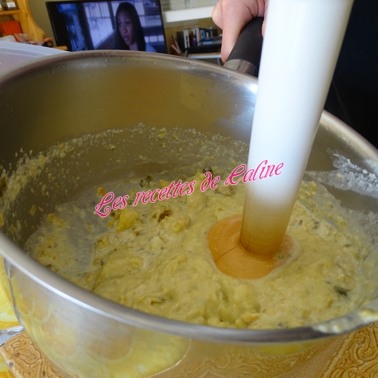 Une fois cuits, égouttez les légumes (gardez le lait et crème de cuisson), mettez-les dans un saladier (ou casserole) puis mixez le tout et si nécessaire mettre un peu de lait et crème pour rendre votre purée onctueuse, réservez au chaud.