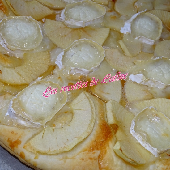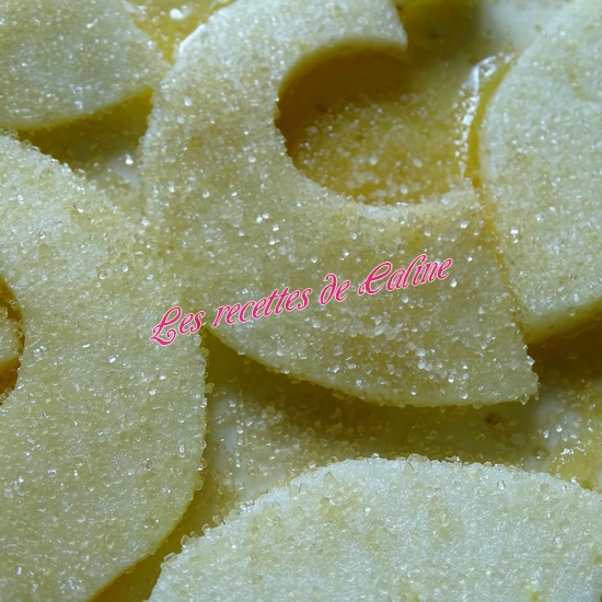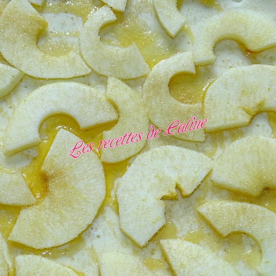 Disposez de façon régulière les tranches de pommes épluchées, les saupoudrer du sucre et déposez le fromage de chèvre de façon aléatoire.