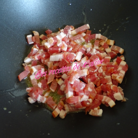 Faites dorer les lardons dans le wok avec une noisette de beurre, ajoutez l’oignon et l’ail