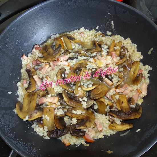 Ajoutez le fond de veau, couvrir et laissez cuire environ 15 min en mélangeant régulièrement (goûtez le riz pour voir s’il est cuit)