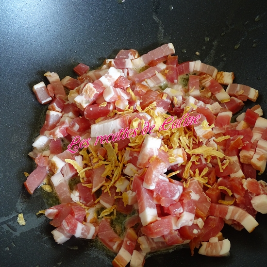 Faites dorer les lardons dans le wok avec une noisette de beurre, ajoutez l’oignon et l’ail