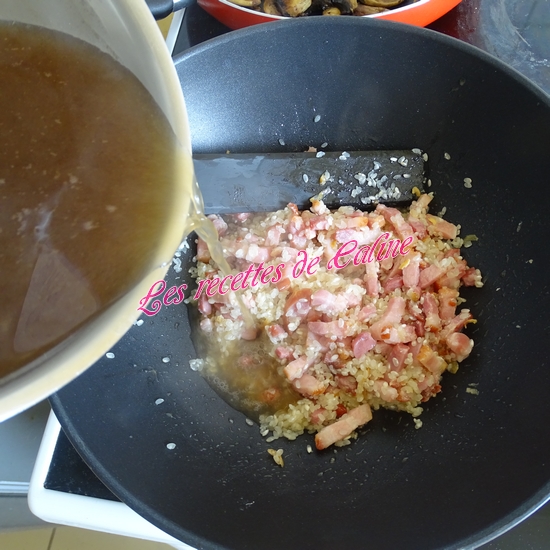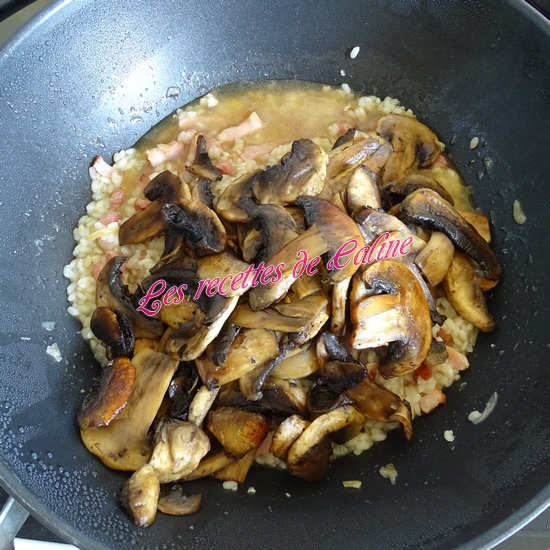 Ajoutez le fond de veau, couvrir et laissez cuire environ 15 min en mélangeant régulièrement (goûtez le riz pour voir s’il est cuit)