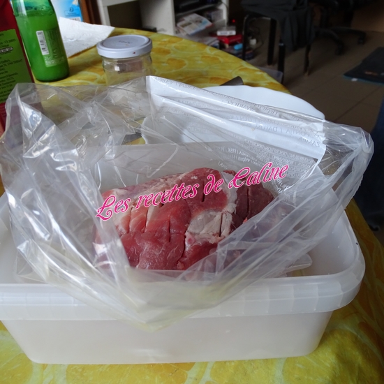 Entaillez le morceau de viande et déposez-le dans le rôti dans un plat creux (ou sac congélation)