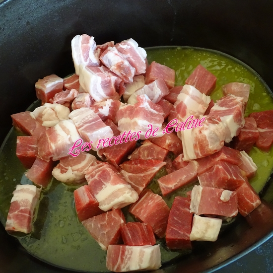 Faire fondre le saindoux (beurre pour ma part) dans une cocotte, portez-le à frémissement puis déposez délicatement les morceaux de viande (sauf la barde) pour éviter que ça gicle partout.