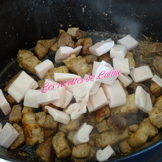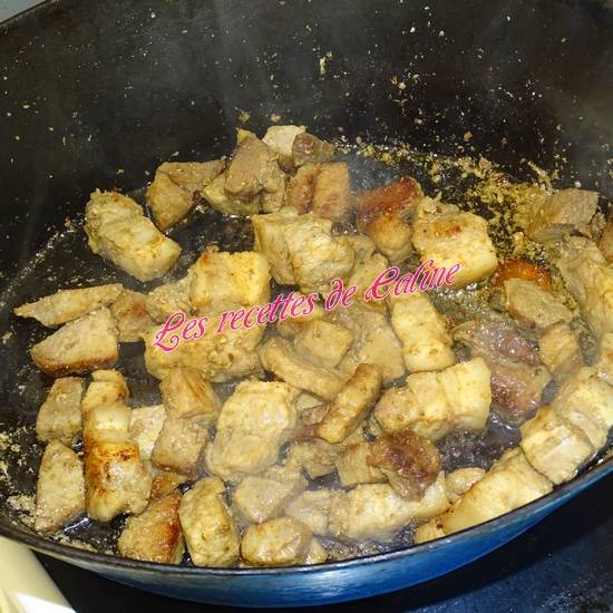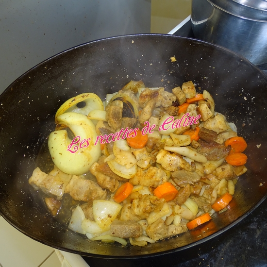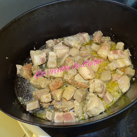 Colorez correctement votre viande sans trop la remuer, une fois bien coloré, ajoutez la barde et bien mélanger, puis ajoutez l’oignon.