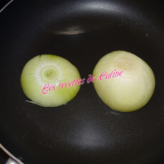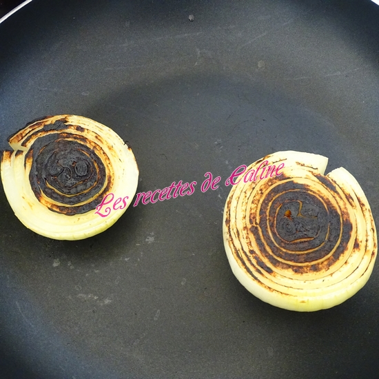 Dans une poêle (déposez une feuille de papier alu ou pas)sans matière grasse, et faire caraméliser (brûlé) un oignon coupé en deux. Réservez.